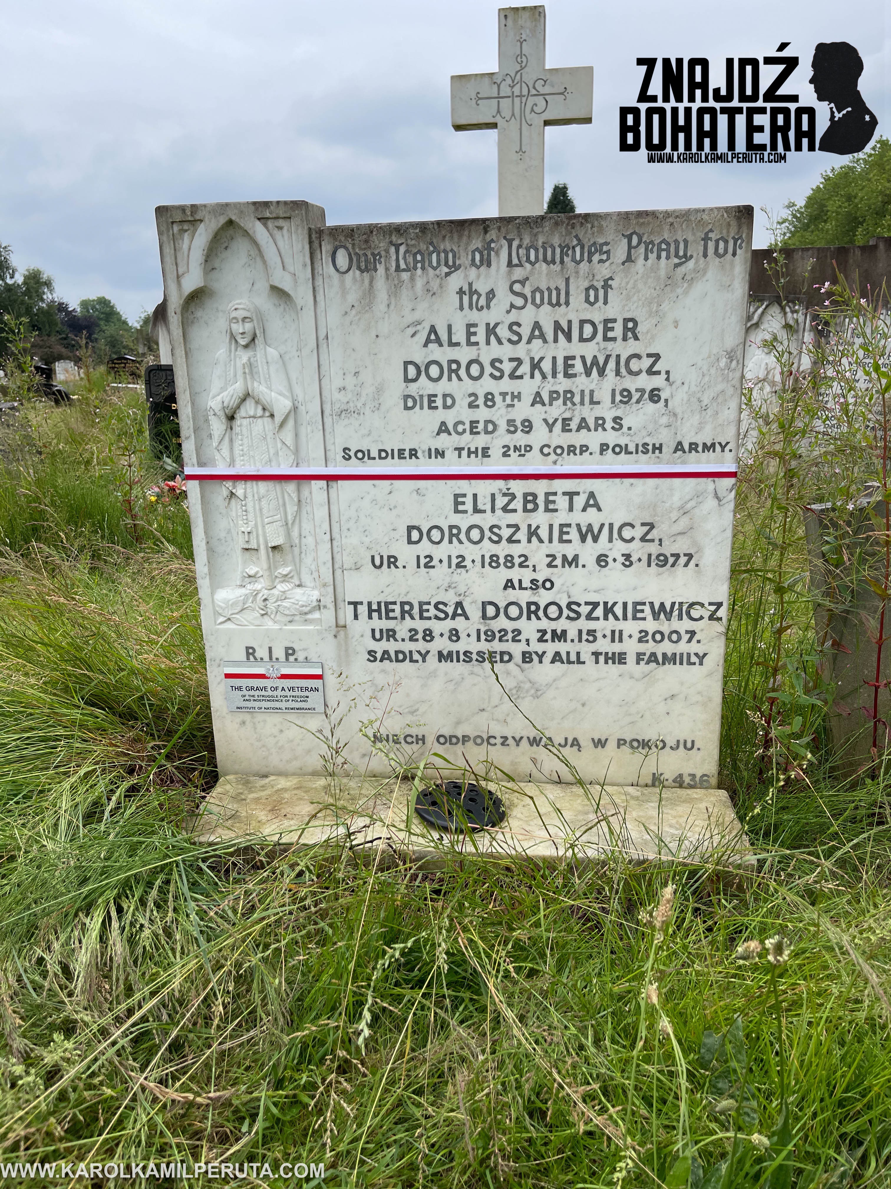 ZAWARTOŚĆ: KOPIA zaświadczenia rejestracji grobu Ś.P. Aleksandra Doroszkiewicza jako „Grób Weterana walk o wolność i niepodległość Polski”.
